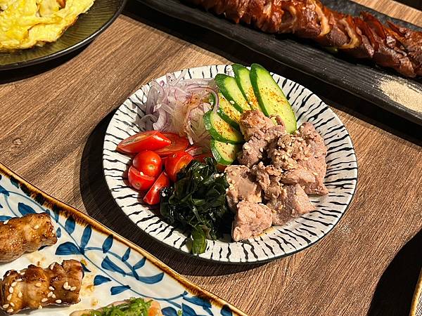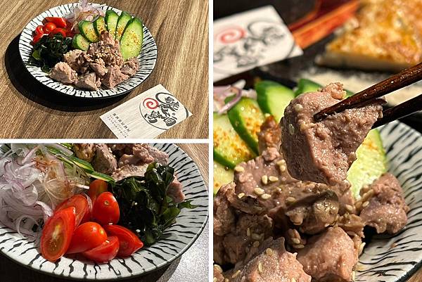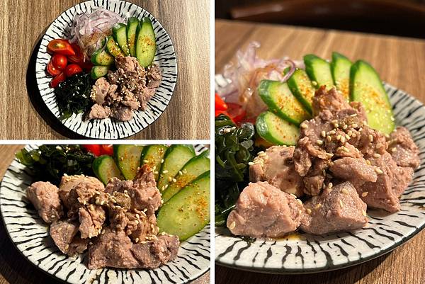 鱈魚肝不會有不舒服的腥味,裏頭配菜除了小黃瓜、小番茄、生洋蔥之外,還有爽脆的海帶芽,等現在的菜餚上桌前來個鱈魚肝沙拉超開胃~