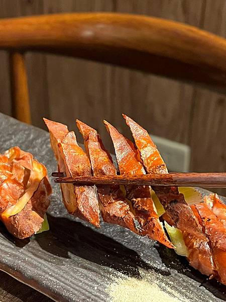 吃起來外脆內彈牙,相當有Q度,不用沾醬就很好吃,一大盤居然只賣200元真的很划算~一般的路邊攤小小一塊就要50起跳,來饕酒窩吃頗划算~